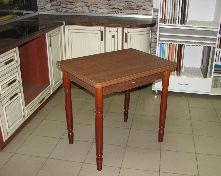 В маленькой кухне можно воспользоваться выдвижным столом, одна часть которого закреплена под рабочей поверхностью, а вторая выезжает при помощи колесиков. Существуют модели, в которых дополнительная столешница выдвигается перпендикулярно кухонному гарнитуру или под углом к нему. Такая поверхность может служить как для приема пищи, так и для ее приготовления. Минимальные размеры маленького обеденного стола на кухню должны составлять 60х60 см.