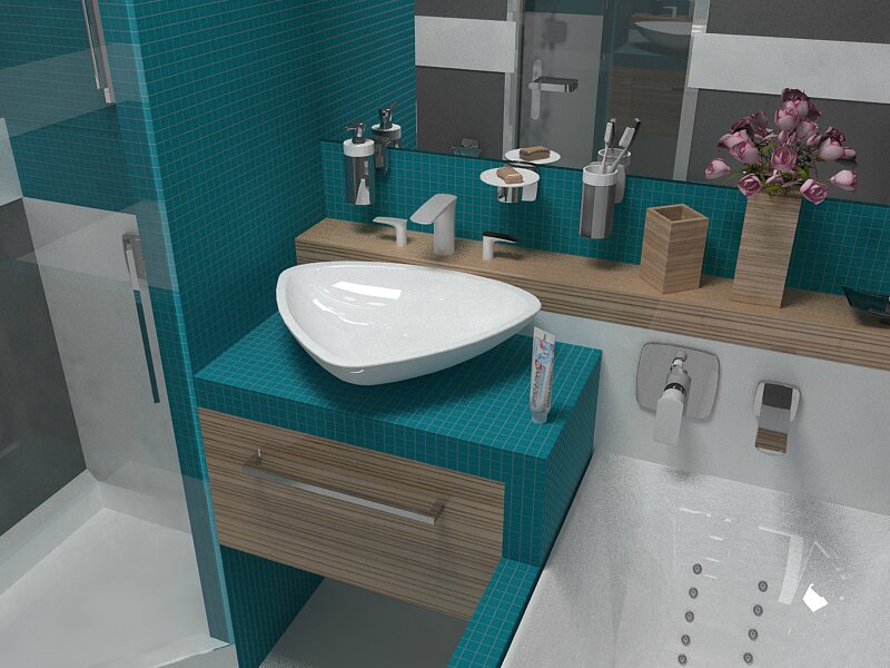 Раковина. Интересный вариант – стеклянная раковина или раковина необычной формы (ассиметричная, угловатая, в форме ракушки). Цвет, форма и размер сантехники целиком зависят от выбранного стиля.