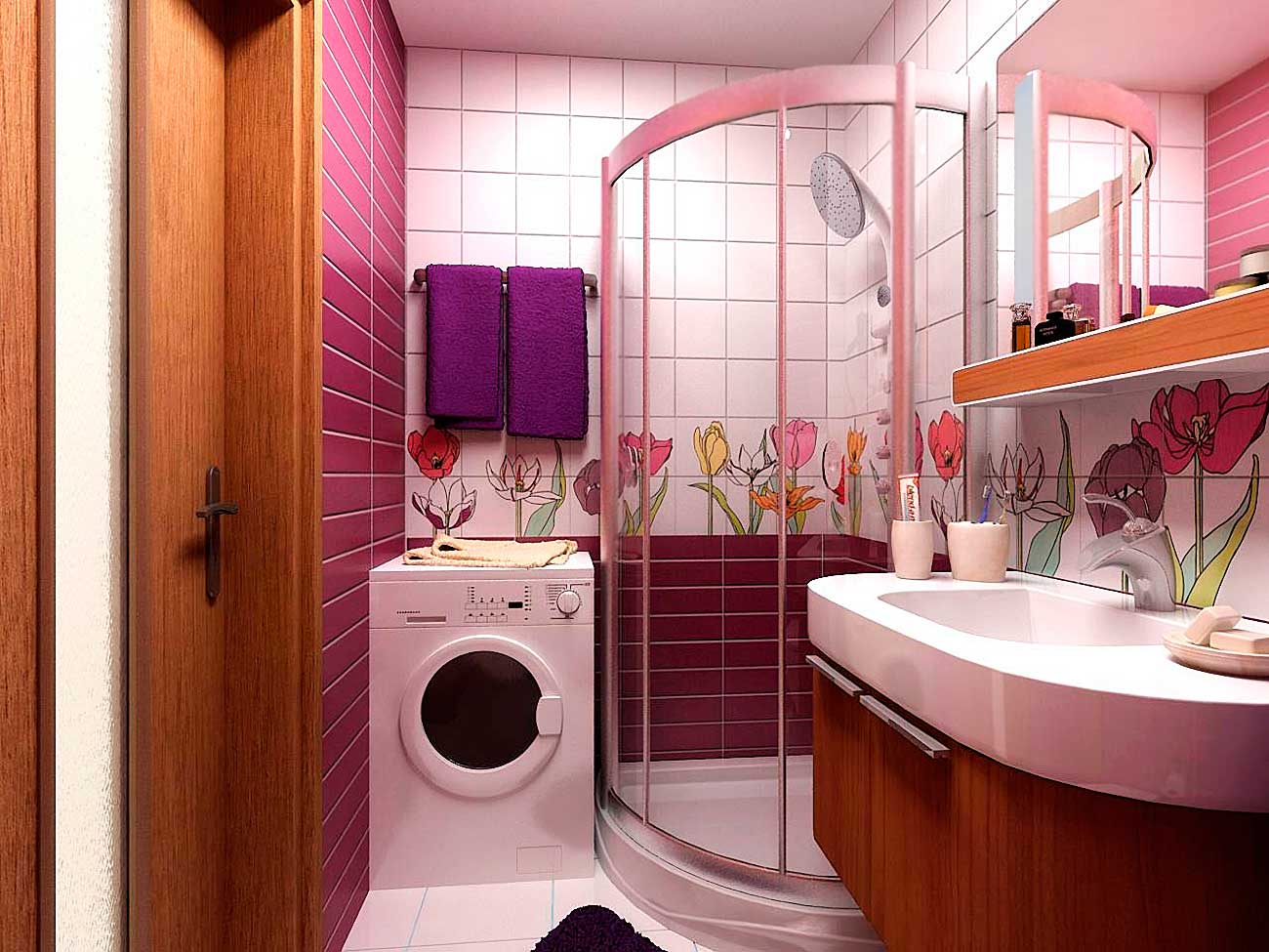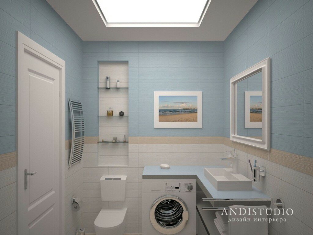 Под умывальником можно поставить не большую стиральную машинку. Если в таком варианте для купания установить душевую кабинку, то останется место для вместительной стиральной машинки.