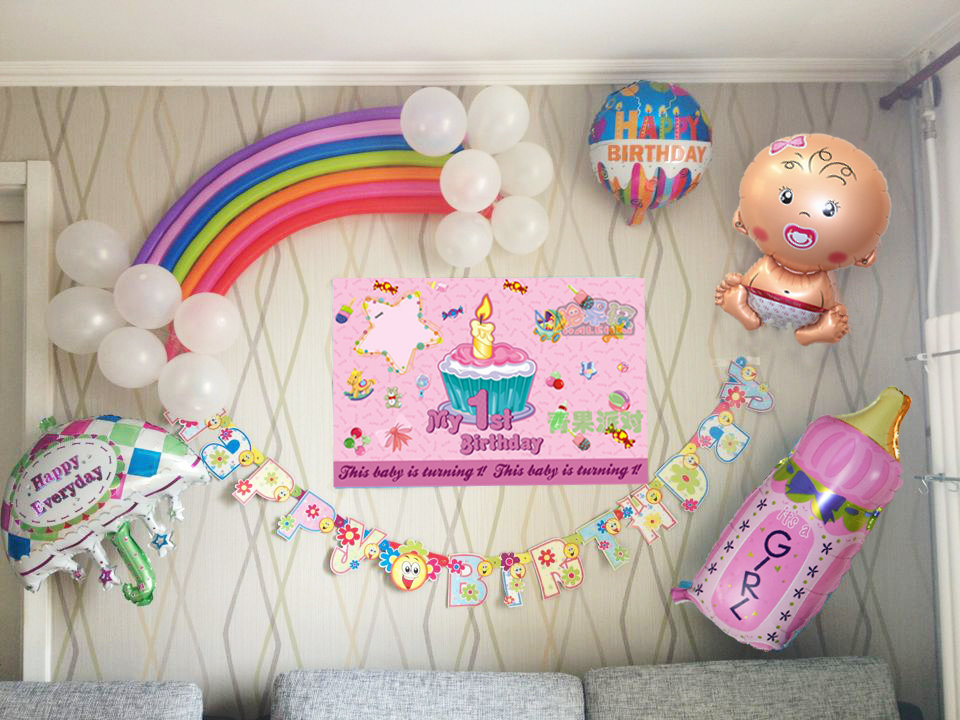 Так как ребенку исполняется 1 годик, эта цифра должна присутствовать в декоре. Ее можно сделать из картона, задекорировав гофрированными розочками нежно-розового цвета, или смастерить из цветной бумаги, фольги. Также можно использовать для этой цели один или несколько воздушных шариков, сделав фигуру в виде единицы. Внутрь шаров можно положить записки с пожеланиями, мелкие игрушки, насыпать конфетти.