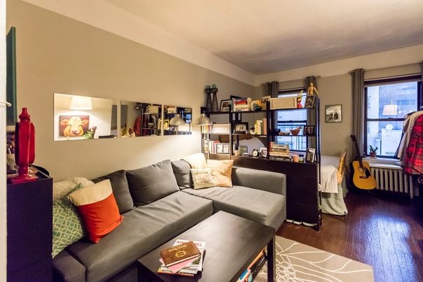 Эта квартира очень маленькая, но в ней есть все важные атрибуты: высокая кровать, кухонный остров и большой удобный диван с журнальным столиком.