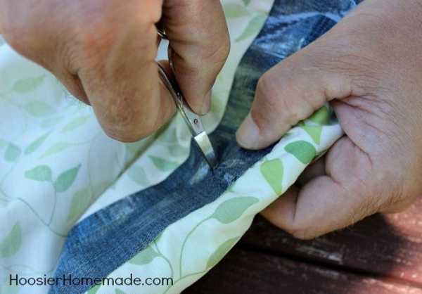 5) Декоративную ткань разрезаем на две части, обработав срезы со всех сторон. Пришиваем отрезки по намеченным полосам, делая подгиб. Лучше прострочить на машинке.