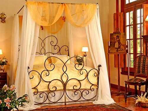 Кованая кровать со стойками и балдахином. Это самая изысканная и дорогая находка. Такие кровати могут представлять собой: