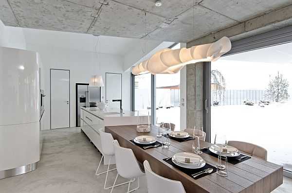 На кухне бетонной может быть стена в зоне приготовления пищи. Белые стены, кирпичная кладка, дерево дополнят интерьер, а хрустальные люстры и мягкие ковры сделают его более мягким и интересным.