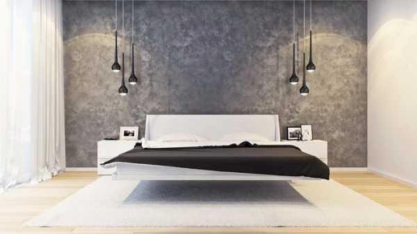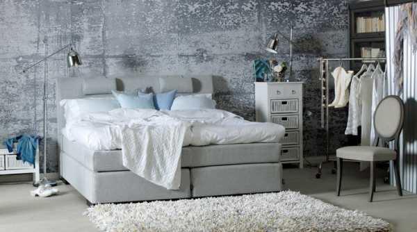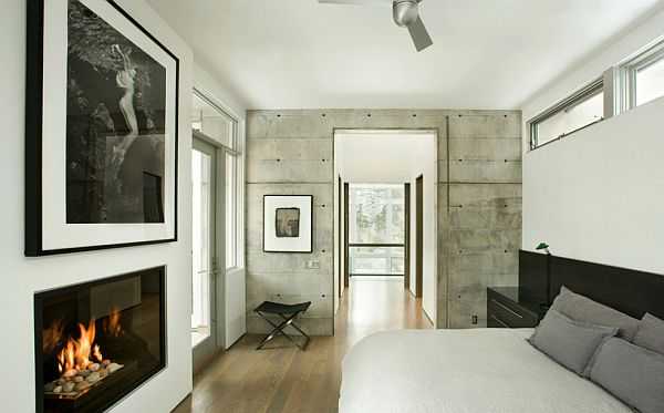 Вносить яркие краски в комнату следует с осторожностью. Спальню с серыми стенами и таким же невзрачным покрывалом оживят подушки из рыжего плюша и шкаф из светлого дуба. С помощью ярких акцентов атмосфера смягчается, и помещение становится более уютным.8. Бетон – универсальный материал для отделки любого помещения в доме