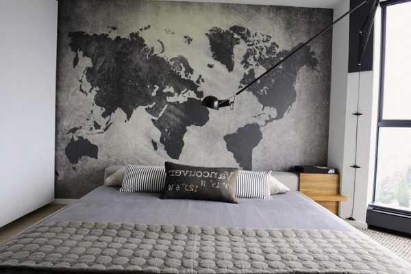 Гладкие бетонные стены сами по себе являются своеобразным интерьерным решением, поэтому не всегда требуется дополнять их. В спальне на фотографии дизайнер не посчитал нужным украшать интерьер и кроме двух миниатюр над изголовьем, в комнате нет ничего примечательного. Но атмосфера, тем не менее, создана динамичная и со своим характером.3. Оформление больших помещений