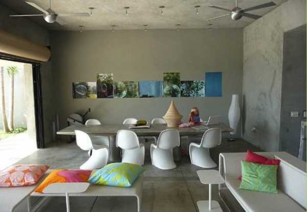Вот еще один пример «бетонной креативности». Здесь бетон сочетается с деревом, белой лакированной мебелью, а также серыми диванами и кроватью.