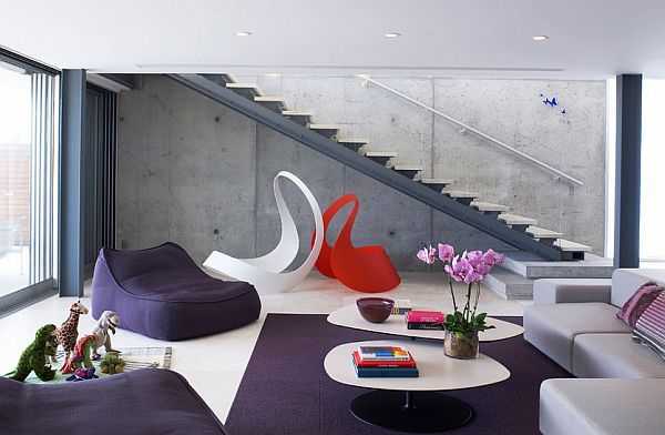Так как общий фон пространства выполнен в серых приглушённых тонах смягчите впечатление яркими пятнами: необычной формой и цветом мебели, например.
