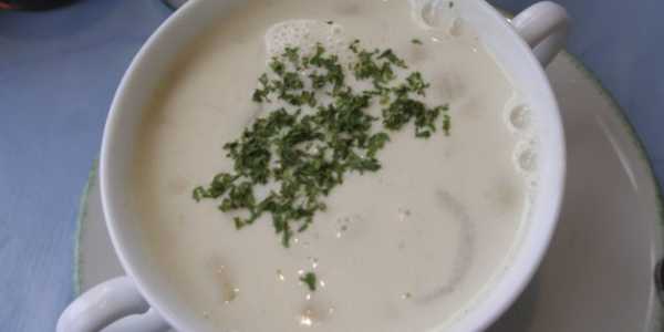 Картофельное пюре разогреваем, чтобы оно стало мягким, смешиваем его с куриным бульоном и добавляем с кастрюлю. Перемешиваем всё. Варим суп на медленном огне. За 30 минут до готовности вливаем аккуратно сливки. Подаём суп с сухариками.