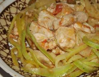 Промойте мясо и нарежьте на кусочки. Залейте его кипятком и варите 30-40 мин. Вытащите и отложите филе, бульон процедите и охладите до комнатной температуры. Очистите, нашинкуйте лук, чеснок, обжарьте на сковородке в масле 3-4 мин. Измельчите в блендере орехи, смешайте их с хмели-сунели, куркумой, солью, перцем и выложите в 3 ст. бульона вместе с луком и чесноком. Обжарьте мясо на сковородке в масле 4-5 мин. Доведите ореховый соус до кипения, влейте в него уксус, добавьте мясо и охлаждайте 4 часа в холодильнике.