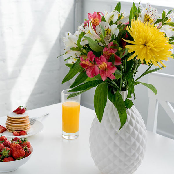 Фрукты выделяют этилен, который негативно сказывается на срезанных цветах. Поэтому если вы хотите наслаждаться букетом дольше, держите его подальше от фруктовой вазы.