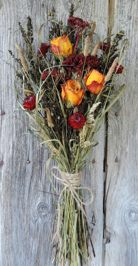 - Букеты из сухоцветов красиво дополняются сухими злаками, ягодами и веточками от деревьев.