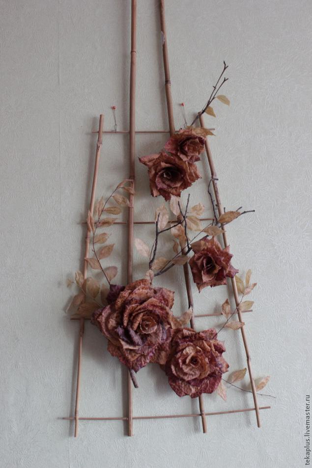 Полученные розочки закрепите, можно использовать нить. После того как сделаете несколько роз, не менее трех, объедините в одну композицию. Снизу подложите несколько больших листов. Элемент декора готов. Можно использовать для украшения интерьера. Хорошо сохраняет свои формы при высушивании.