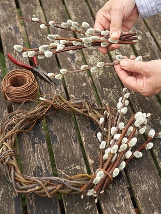 Возьмите тонкие прутки ивового дерева и переплетите их между собой в плотное кольцо, затем аккуратно обвяжите их медной проволокой. В качестве дополнительного украшения для венка можно использовать листья деревьев, цветы, лесные шишки.