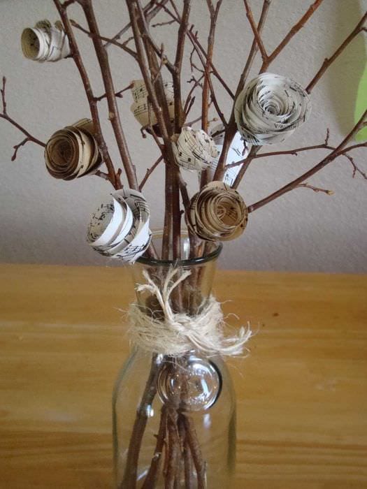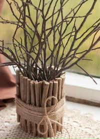 - В вазу можно помочь цветы. С наружной стороны емкости следует закрепить с помощью клея или веревки небольшие фрагменты из веток.
