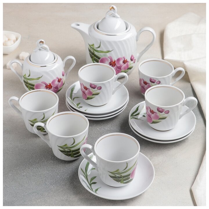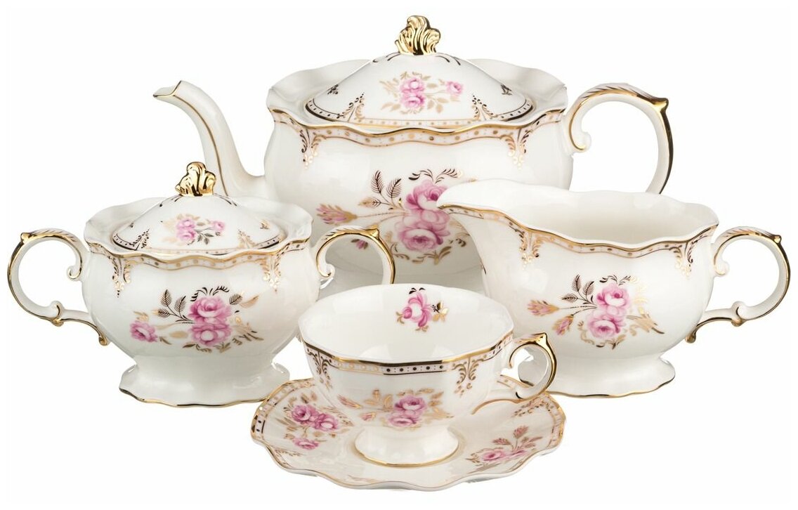 Чайный сервиз, выполненный из костяного фарфора и декорированный нежным цветочным рисунком.