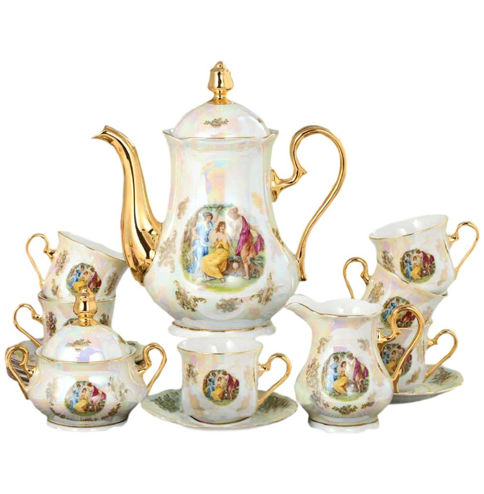Сдержанная классическая форма подчеркивает роскошь декоров и изящество отделки. Мягкая кремовая основа фарфора, тончайшие оттенки красок и золотистая роспись превосходно дополняют друг друга.Чайный сервиз Falkenporzellan создаст атмосферу настоящего светского приема.