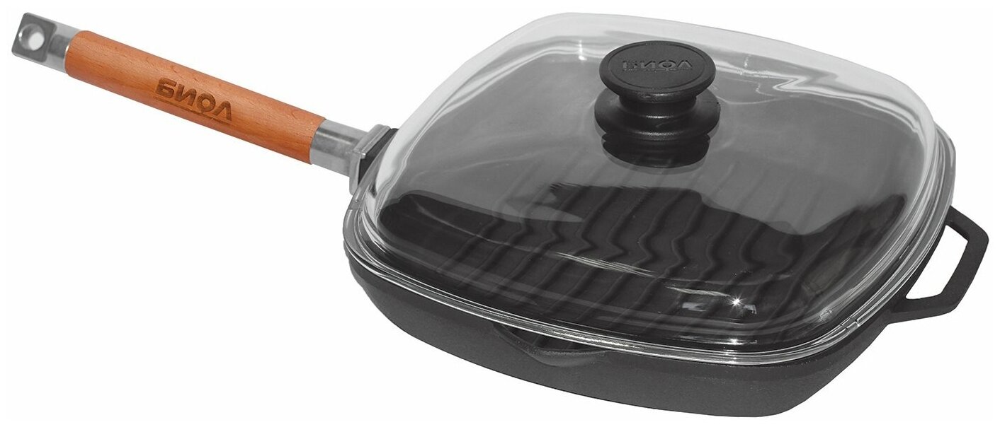 Чаще всего сковорода гриль имеет не одну, а две ручки. Это упрощает эксплуатацию, и позволяет даже в такой посуде запекать пищу.