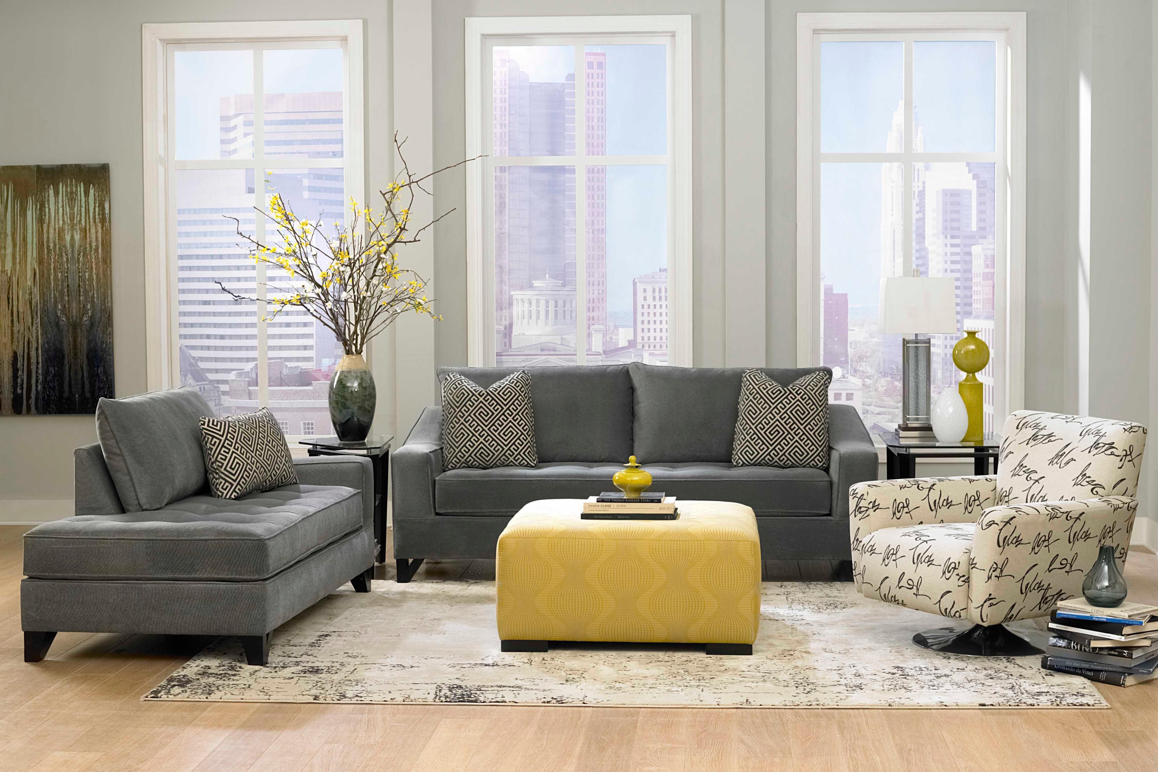 4. Широкий диван + плюшевая пуфик. В комнате в форме туннеля (с циркуляцией воздуха вниз по одной стороне помещения), возможно, лучше отказаться от использования каких-либо боковых стульев напротив дивана и вместо этого позволить оттоманке стать вашим развлекательным решением.