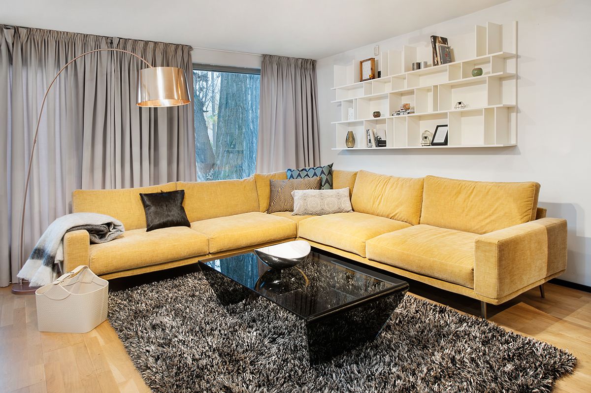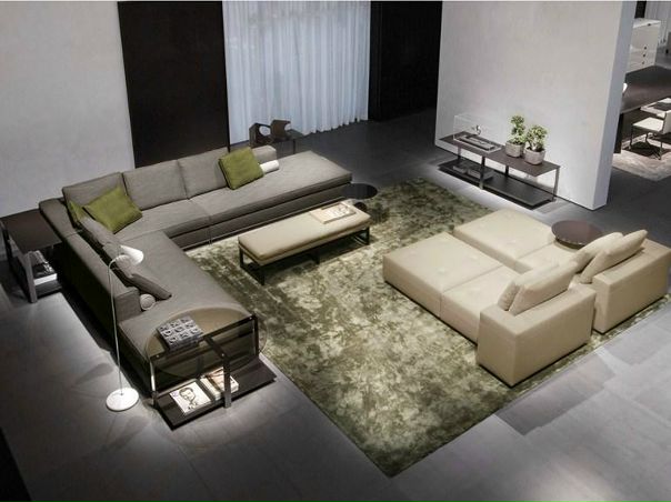Используйте самый большой современный угловой блок, желательно проложенный от стены к стене, чтобы он выглядел почти встроенным. Это намного изящнее, чем упираться ручками традиционного дивана в стены, которые выглядят намного теснее.