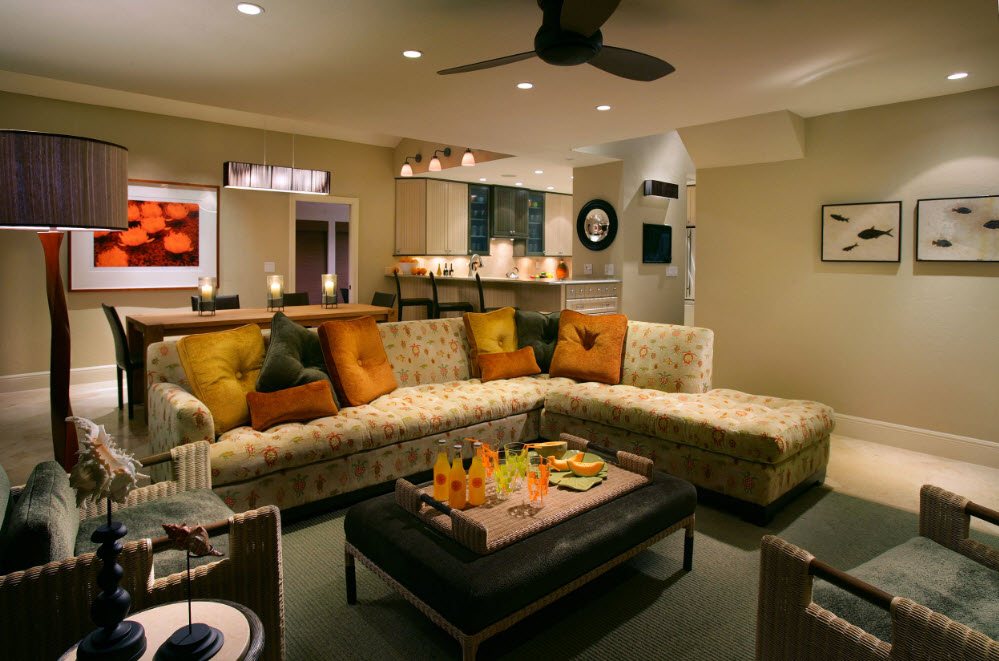 Не забывайте, что это все же комната отдыха, поэтому стоит поработать над уютом, грамотно подбирая текстиль и мебель. Можно попробовать подобрать мягкие стулья, повесить на стенах картины, а на потолке светильники на длинном шнуре. Тогда эта композиция не будет выбиваться из идеи гостиной и заодно разгрузит кухню, на которой получится за счет такого переноса разместить больше рабочих поверхностей и техники.