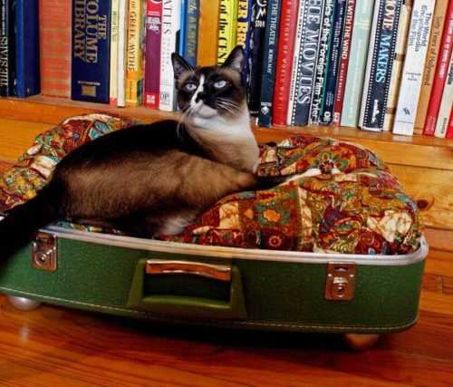 Уютные лежанки для котов и маленьких собак – еще одни вариант применения бабушкиного багажа. Если подложить коврик с подогревом, что животное будет безмерно благодарно.