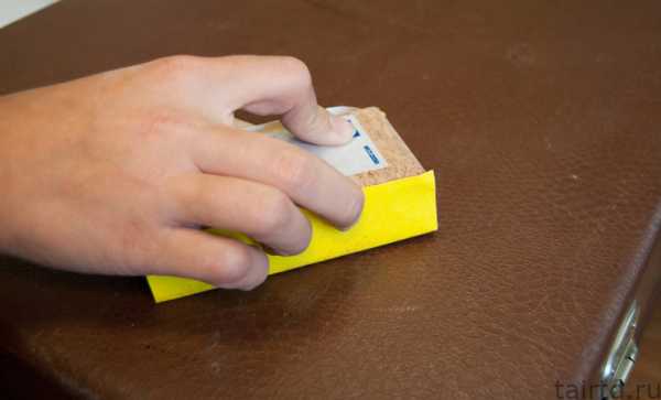 Работа предстоит долгая, потому что чемодан большой. Первым делом тщательно ошкуриваем все стороны чемодана наждачной бумагой. Лучше воспользоваться держателем для наждачной бумаги для ускорения процесса.