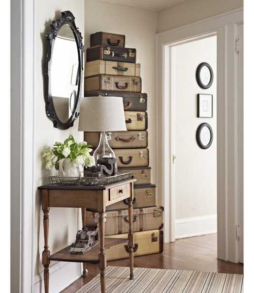 Старые чемоданы в интерьере могут послужить Вам столиком для мелочей: ключей, телефонов, косметики и т.д. Причем преимущество такого столика будет заключаться еще и во вместительной «столешнице», согласитесь, такой вместительный чемодан сможет вместить в свои недра массу редко-используемых вещей.