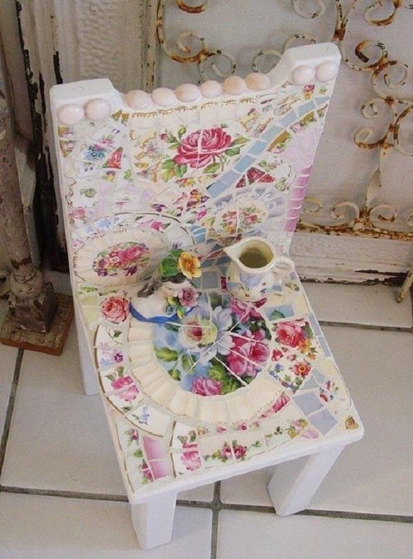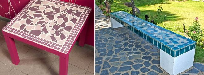 Вот и сейчас хотим предложить несколько замечательных примеров для вашего вдохновения, где уже видавшая виды садовая мебель, и другие предметы быта, приобретают вторую жизнь, благодаря наложению на их поверхность битой плитки.
