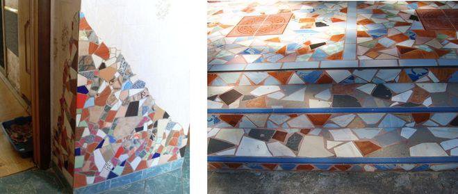 Из битой плитки можно сделать частичное или полное декорирование стен или лестниц на даче. Правда, в данном случае, композиция будет играть только декоративную роль.