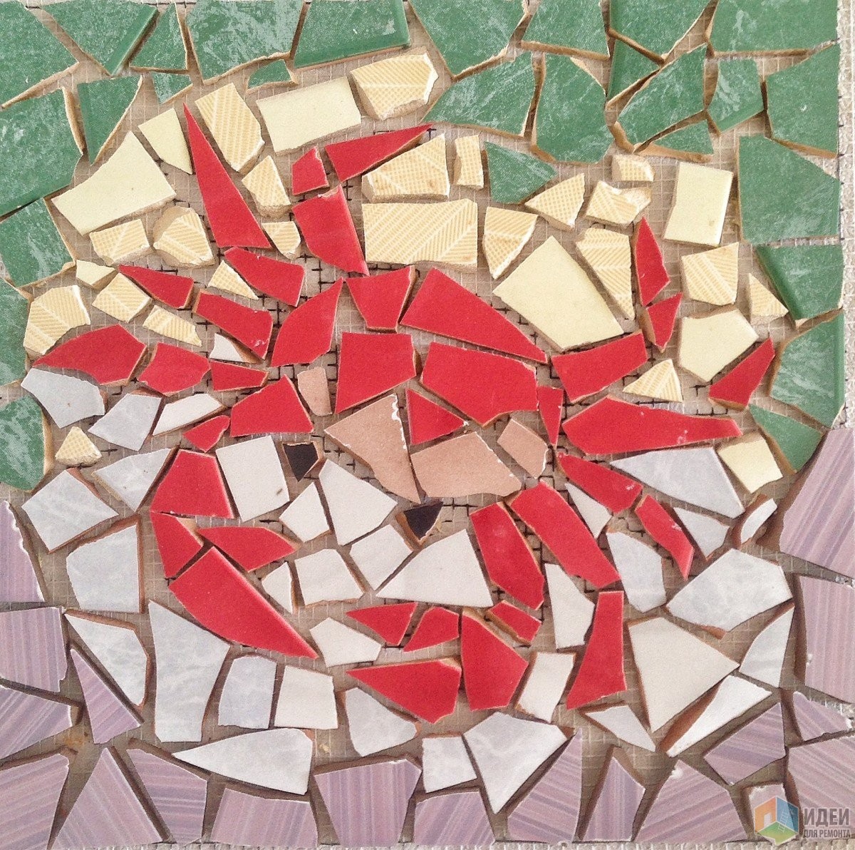 Как правило, после ремонта остается много битого или обрезанного кафеля. Именно эти отходы производства чаще всего используются для создания мозаики. Намного реже для этих целей применяется целая старая кафельная плитка. О том, как сделать мозаику из битого или целого кафеля мы уже подробно рассказывали в этой статье.