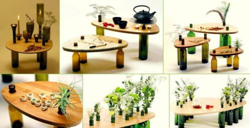 Высверливаем отверстия для горлышек бутылки и вставляем их. И ваш стол непременно порадует своей оригинальностью не только вас, но и ваших гостей.