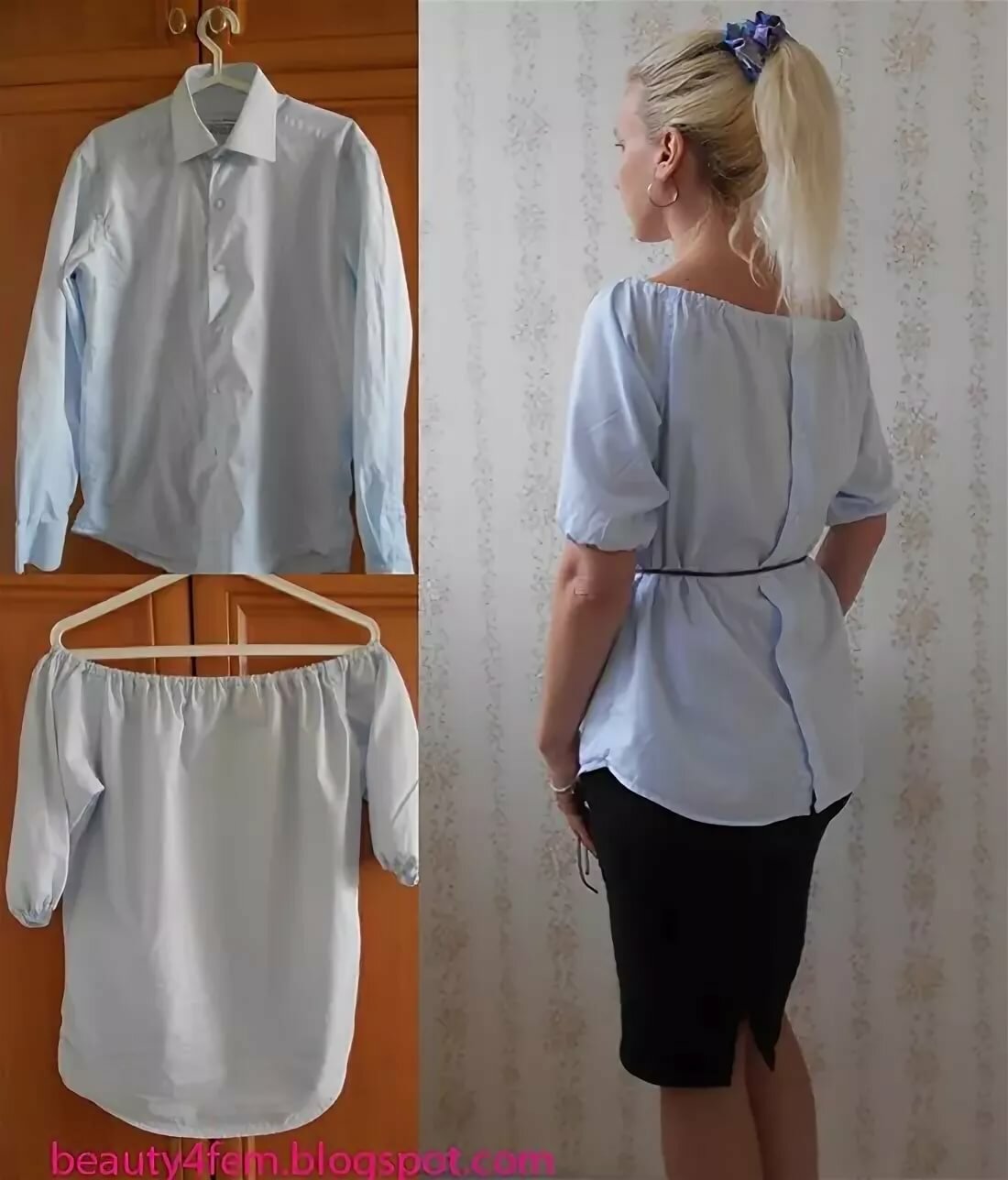 Для переделки: верх мужской рубашки отрезается, края обрабатываются тесьмой.