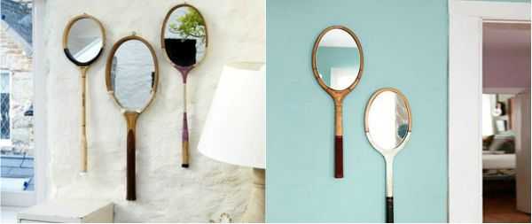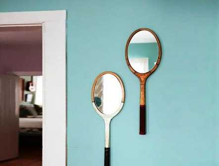 Для этого проекта достаточно вырезать зеркало в форме овала, горячим клеем приклеить его к ракетке и повесить изделие на стену.