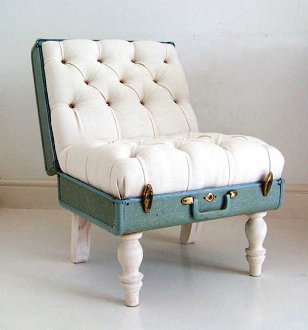 У многих из нас в кладовке или на полке пылится старый чемодан, которым давно не пользуемся, а выкинуть жалко. Мы предлагаем подарить вторую жизнь чемодану и сделать из него кресло. Для этого вам потребуется четыре винтажные ножки, которые можно приобрести в магазине рукоделия и две подушки, размером с чемодан. Прикрутите ножки к внешней стороне чемодана, а подушки положите в две внутренние его части.