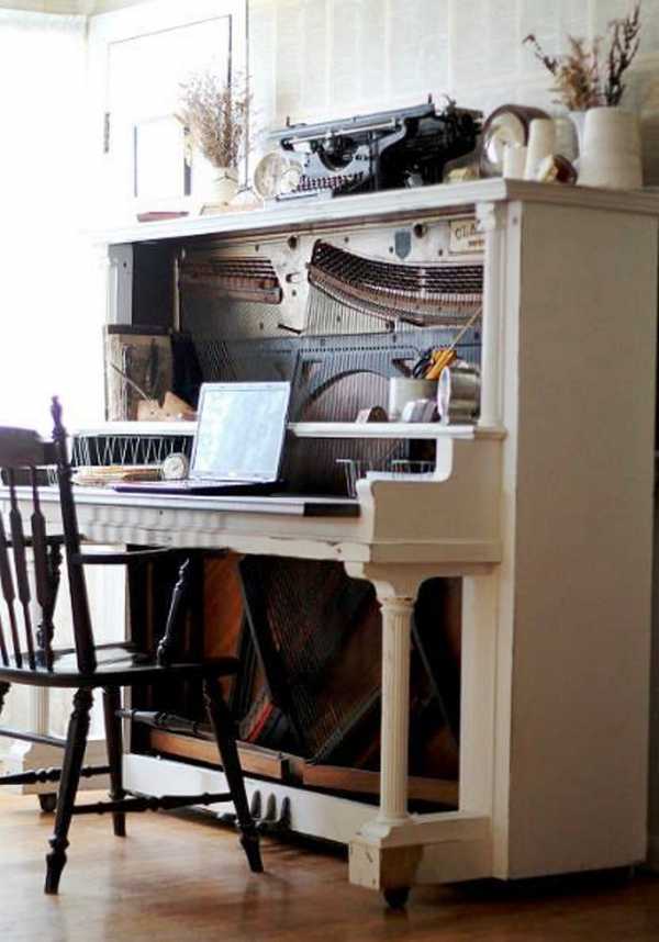 Если у вас любовь к старому роялю, не спешите его выбрасывать. Его можно с успехом использовать в качестве стильного рабочего стола. Достаточно снять клавиши и заменить их на столешницу.