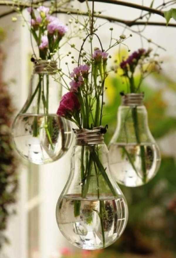 Старые лампы можно использовать в качестве подвесных ваз. Для этого нужны плоскогубцы и отвертки, которые облегчат удаление внутренних элементов лампы. Помимо инструментов будет необходим шнурок, благодаря которому вазы создадут оригинальный висячее украшение.