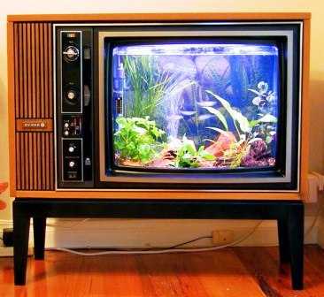 Давайте сделаем из них аквариум! Для этого удалите содержимое телевизора, а вместо экрана вставьте стекло! Обработайте все стыки герметиком и заполните аквариум водой, рыбками, растительностью.