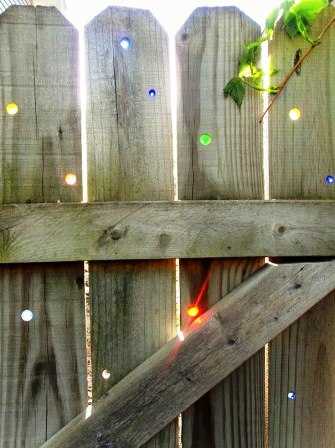 Приклейте к забору разноцветные стеклянные шарики, тем самым украсив забор.