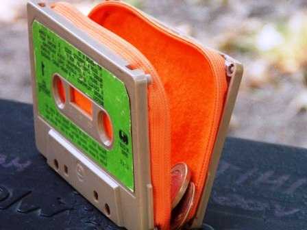Удалите ленту из кассеты, а внутрь вставьте и приклейте тканевый кошелек на молнии.