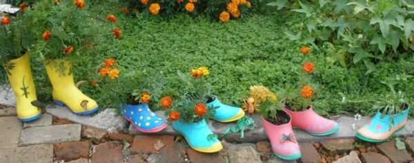 Старую обувь принято выбрасывать, однако есть решение получше, ведь в поношенные туфли, сапоги или ботинки можно насыпать землю, превратив их в оригинальные цветочные горшки. Конечно, кожа, кожзаменитель или текстиль – не лучшие материалы в плане влагоустойчивости и прочности, а вот резиновую обувь можно использовать в качестве горшков без каких либо дополнительных средств: просто насыпьте внутрь землю и посадите в них подходящие по размеру цветы. Менее прочная обувь может послужить как подставка для обычных горшков.