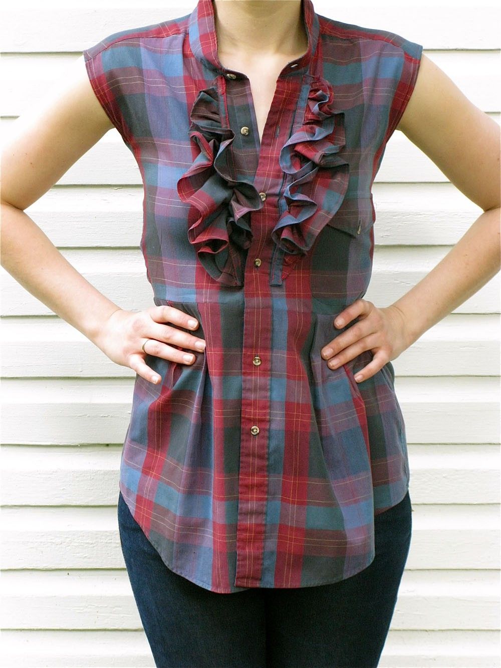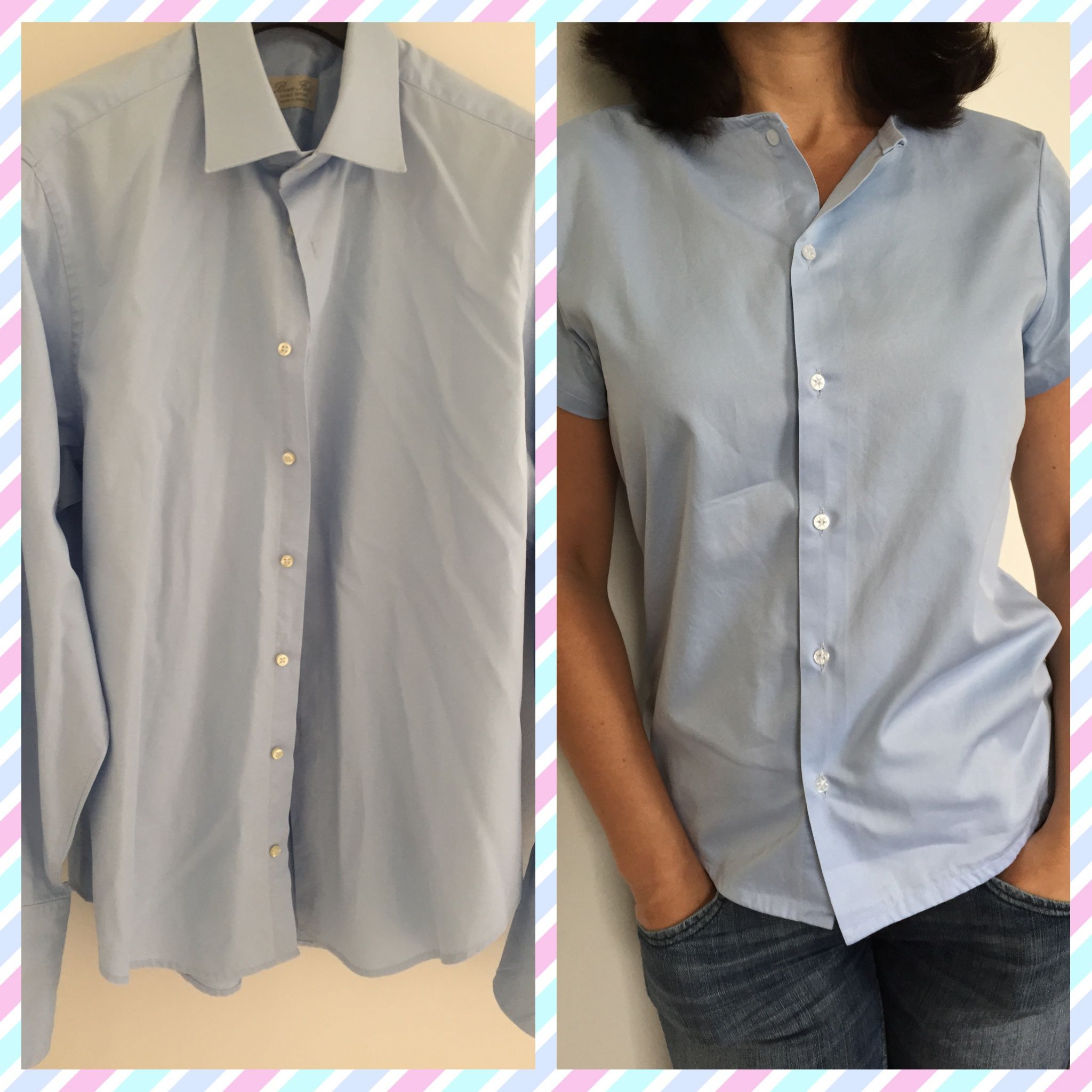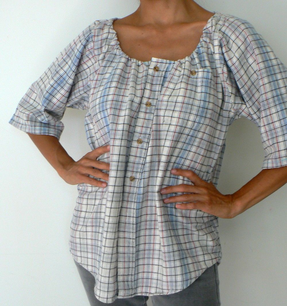 Выберем из мужских рубашек основную. Из неё мы выкроим главные детали спинки и переда. В этой рубашке воротник и застёжка должны быть в хорошем состоянии. Закладываем на талии складочки, закалываем булавками.