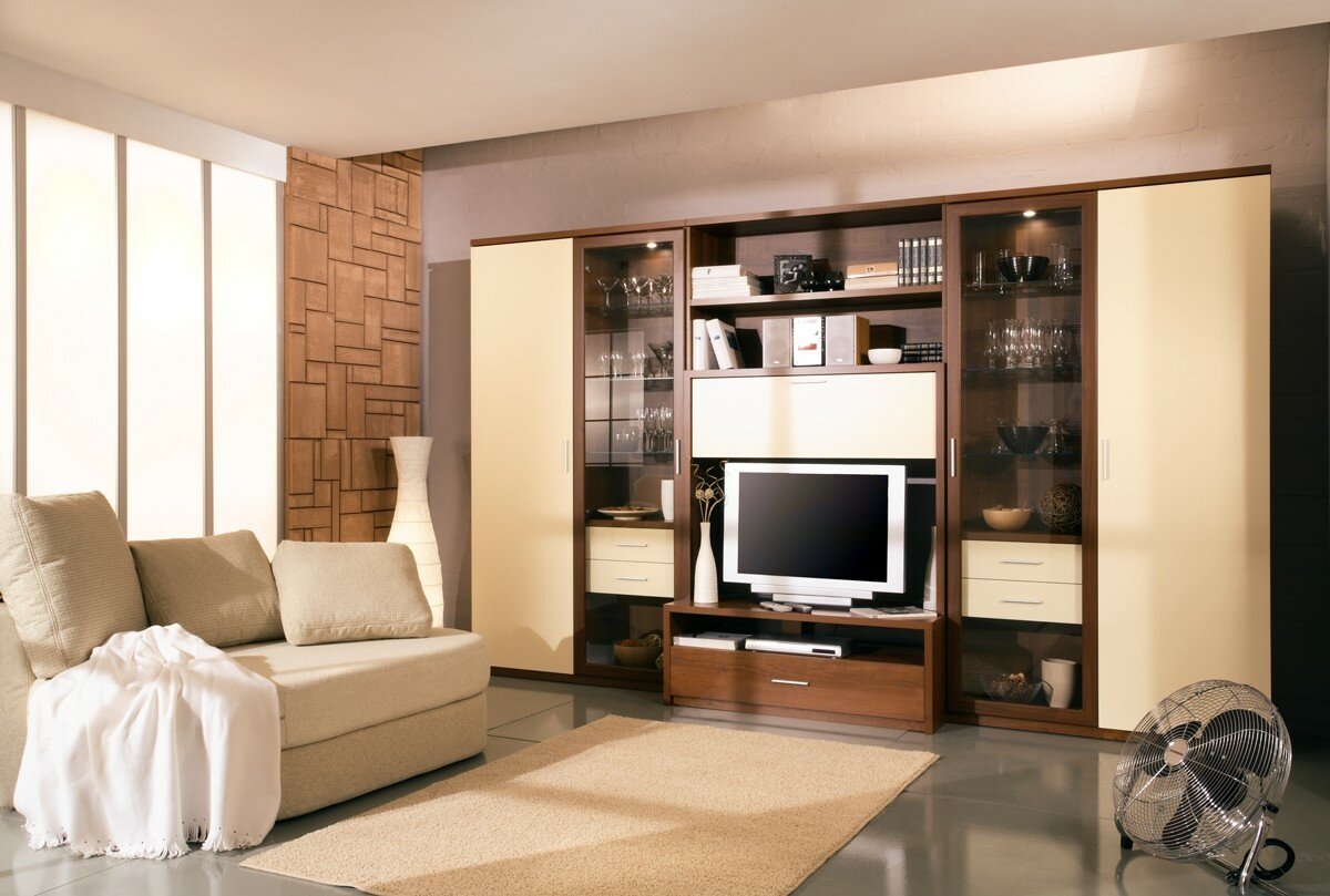 Подбирая для гостиной или зала оригинальный дизайн корпусной мебели, рекомендуется обратить внимание на мини конструкции, которые ценятся за компактность и повышенную эргономику обустраиваемых зон.