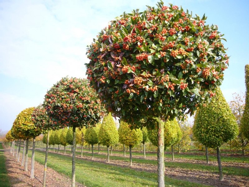 Все знают про шаровидные клены, которые достигают 2-3 м, с густой кроной достигающей 2-2,5 м, также встречаются ясени, акации, ивы, туи и лиственницы. Шаровидные формы часто используют в оформлении симметричного сада. Из таких растений создают аллеи, высаживают вдоль оград или вокруг зданий. Дополнят шаровидные деревья, пирамидальные деревья или кусты.