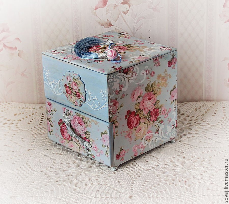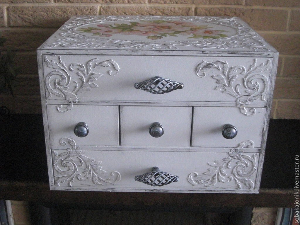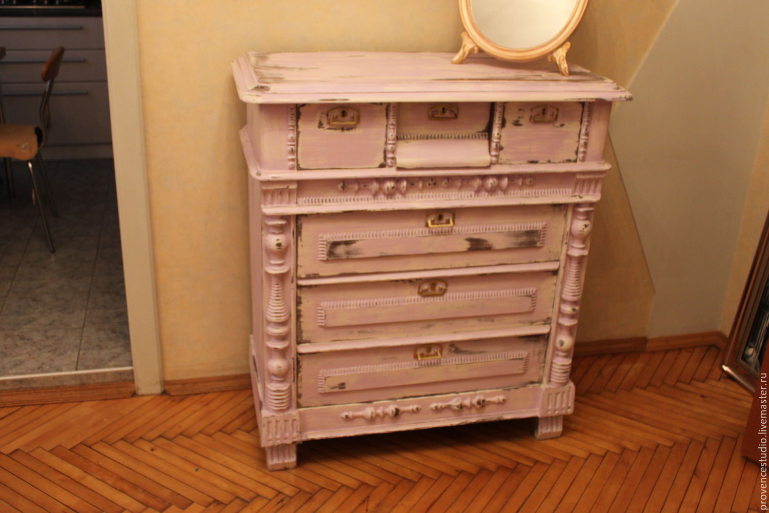 Снимите фурнитуру, ящики и столешницы комода. Обработайте всю поверхность наждачкой и протрите мокрой губкой. Нанесите первый слой краски и оставьте сохнуть. Следующие потертости будут намеренными, а выполняются они наждачной бумагой и свечой. После нанесите краску другого оттенка (на ваш вкус) и протрите губкой те участки, которые были покрыты воском: в этих местах краска сотрется. Финишный этап – это техника декупаж или авторская роспись. Далее все покрывается кракелюром.