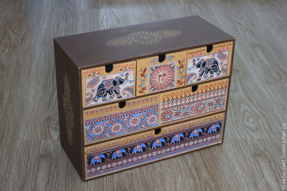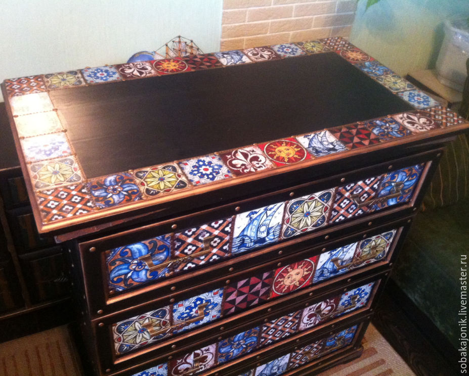 С комода снимается фурнитура, и изделие очищается. После поверхность покрывается неровным слоем шпатлевки: чем небрежнее, тем лучше. Покройте комод белой краской и разметьте скотчем зоны для окрашивания. Разведите алую и синюю краски. Пятнистость, которая может появиться в процессе окрашивания, – только плюс. Столешница и бока обрабатываются наждачкой. Готовая работа покрывается топлазурью (используйте для этого губку). Идеальный тон топлазури – «орех». После вбейте декоративные мебельные гвозди и установите фурнитуру, затемненную масляной коричневой краской.