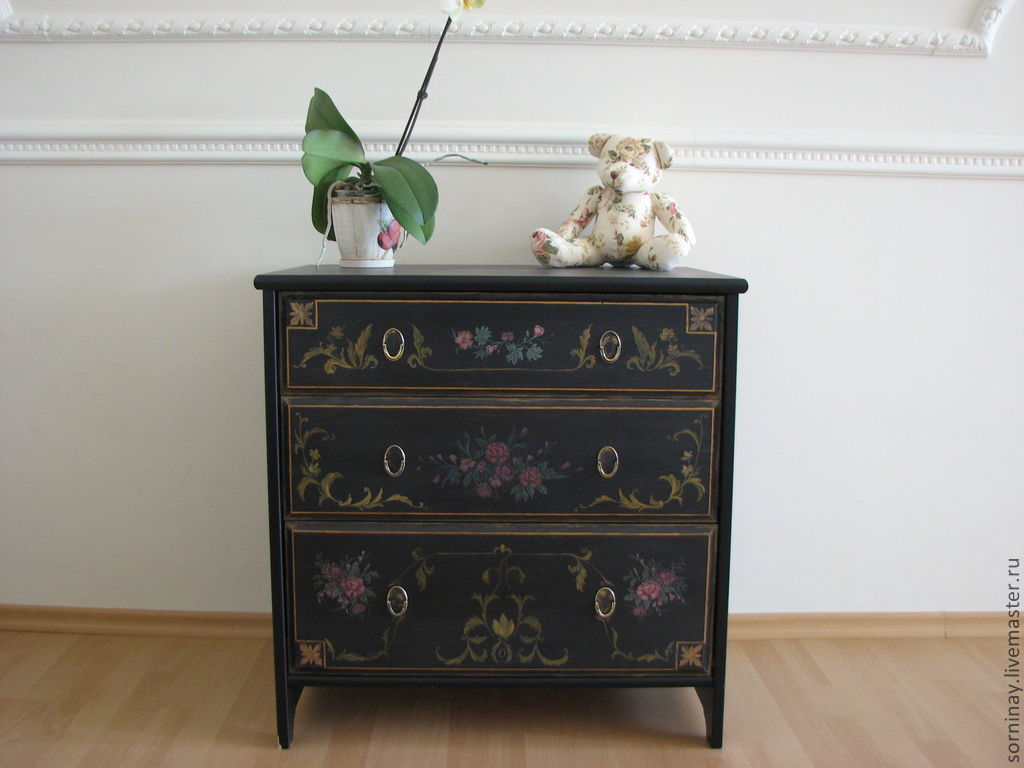 А вот для тех, кто не испугался работы с наждачной бумагой, шпателем и акриловой краской, подготовлена поэтапно расписанная реставрация комода. Процесс состоит из нескольких шагов: снятие старого покрытия краски или лака, тщательное шкурение, проверка на сколы и прочие неровности, местная шпатлевка дефектов, покраска и финальное декорирование комода.