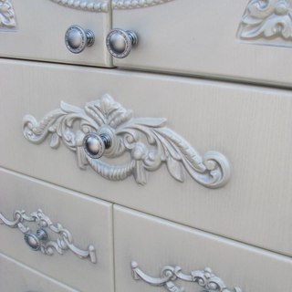 Декор комода в этом стиле начинается съемом фурнитуры и вытягиванием всех ящиков. Трафареты крепятся на поверхности и покрываются шпатлевкой.