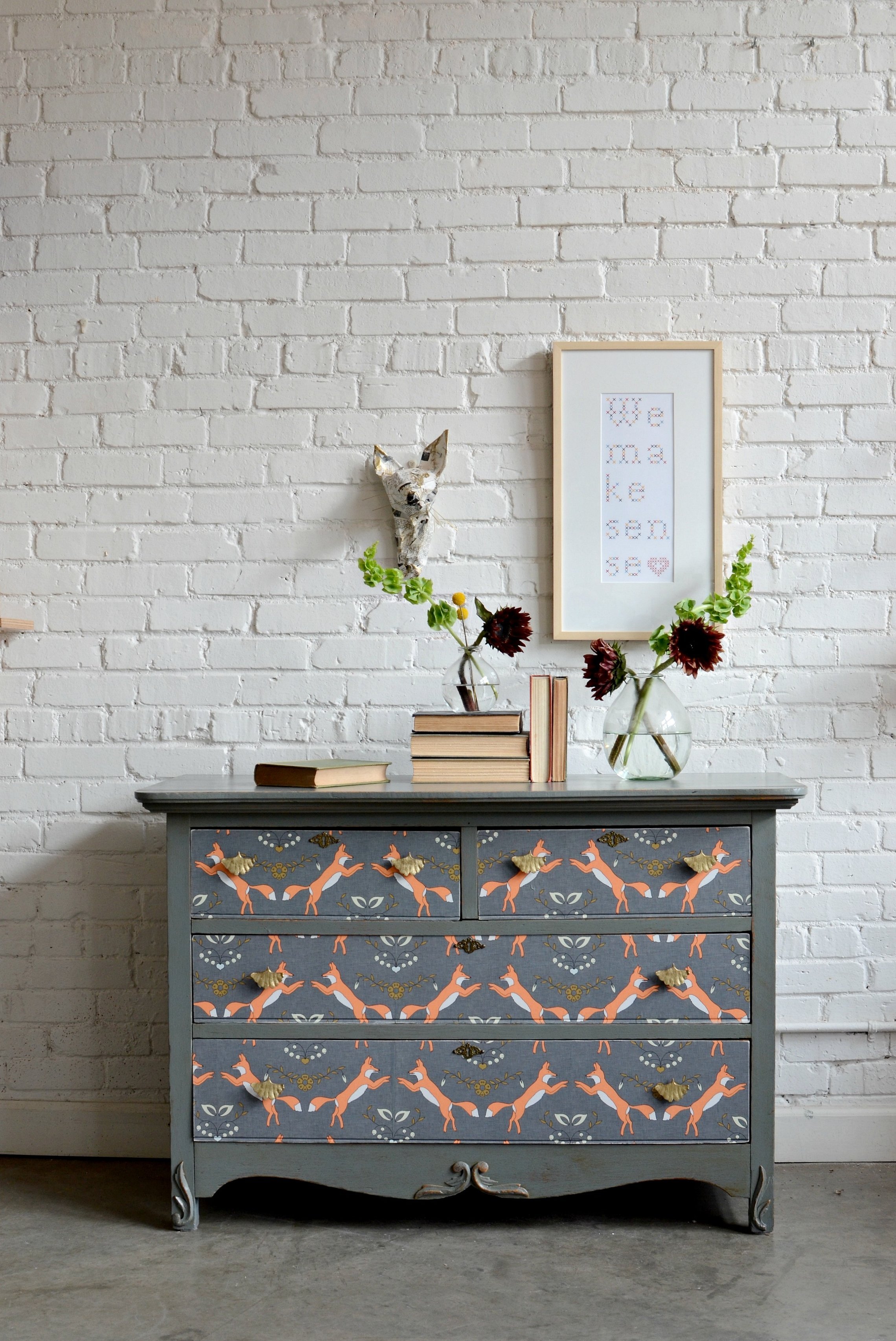 Ткань и бумага — не единственное, что вы можете использовать для модификации комода Podge — вы также можете использовать обои.