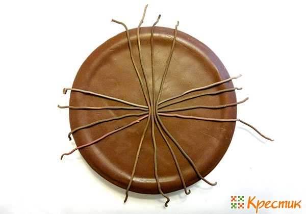 Самое оптимальное количество отрезков от 8 до 10 шт. Выкладываем из них круг и оборачиваем слоем белого цвета (для оттенка можно добавить каплю оранжевого)